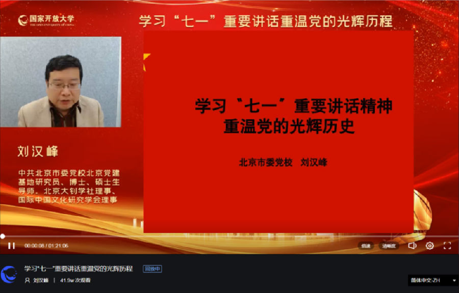此次课程由中共北京市委党校北京党建基地研究员,博、硕士导师刘汉锋负责讲授。在名师指引下,国开师生围绕习近平总书记“七一”重要讲话开展学习,重温了中国共产党的光辉历程。“七一”重要讲话系统阐述了以史为鉴、开创未来的“九个必须”,为全党全国各族人民向第二个百年奋斗目标迈进指明了前进方向、提供了根本遵循。回顾党史,从建党的开天辟地,到新中国成立的改天换地,到改革开放的翻天覆地,再到十八大以来不断取得历史性成就,根本原因在于中国共产党始终坚守了为中国人民谋幸福、为中华民族谋复兴的初心和使命。