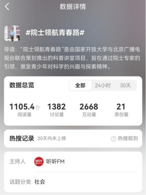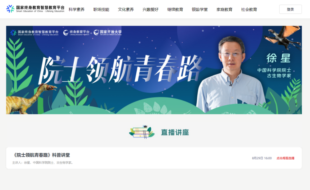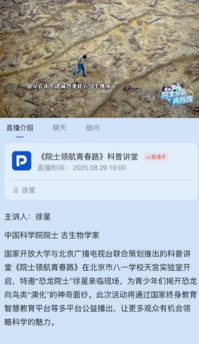 为深入推进教育、科技、人才“三位一体”协同融合发展,落实首个“全国科普月”工作要求,国家开放大学与北京广播电视台联合推出“院士领航青春路”科普讲堂活动。首期活动邀请中国科学院院士、著名古生物学家、2025未来科学大奖生命科学奖获得者徐星走进北京市八一学校天宫实验室,与青少年一起探讨科学知识,分享科学故事。活动在国家终身教育智慧教育平台、北京广播电视台官方客户端听听FM、北京时间、BRTV财经频道、BRTV新闻广播、国家开放大学终身教育平台及国家开放大学新媒体矩阵等平台进行播出。截至目前,活动已上线一周,全网播放量达1207.9万。