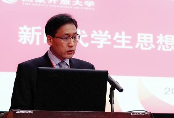 张文斌发表讲话。他指出,在全国教育系统深入贯彻落实全国教育大会、全国高校思想政治工作会议精神这样一个新形势下,国家开放大学专门组织研讨新时代学生思想政治工作这一重要课题,意义重大,影响深远。他从“一个目标引领”“一个体系贯通”“一项改革驱动”“一种方法推进”4个方面,阐述了高校学生思想政治教育工作的目标、体系、方法以及改革的思考,既有对党中央、教育部党组关于思想政治教育工作精神的传递和解读,更有鲜活的学生思想教育工作的案例。他强调,开放大学作为我国高等教育的重要组成部分,在很多方面与普通高校学生思想政治工作相类似,都是培养中国特色社会主义的建设者和接班人。他表示,下一步要把国家开放大学380多万大学生纳入到整个大学生思想政治工作体系当中来,纳入到整个高校思想工作当中来。