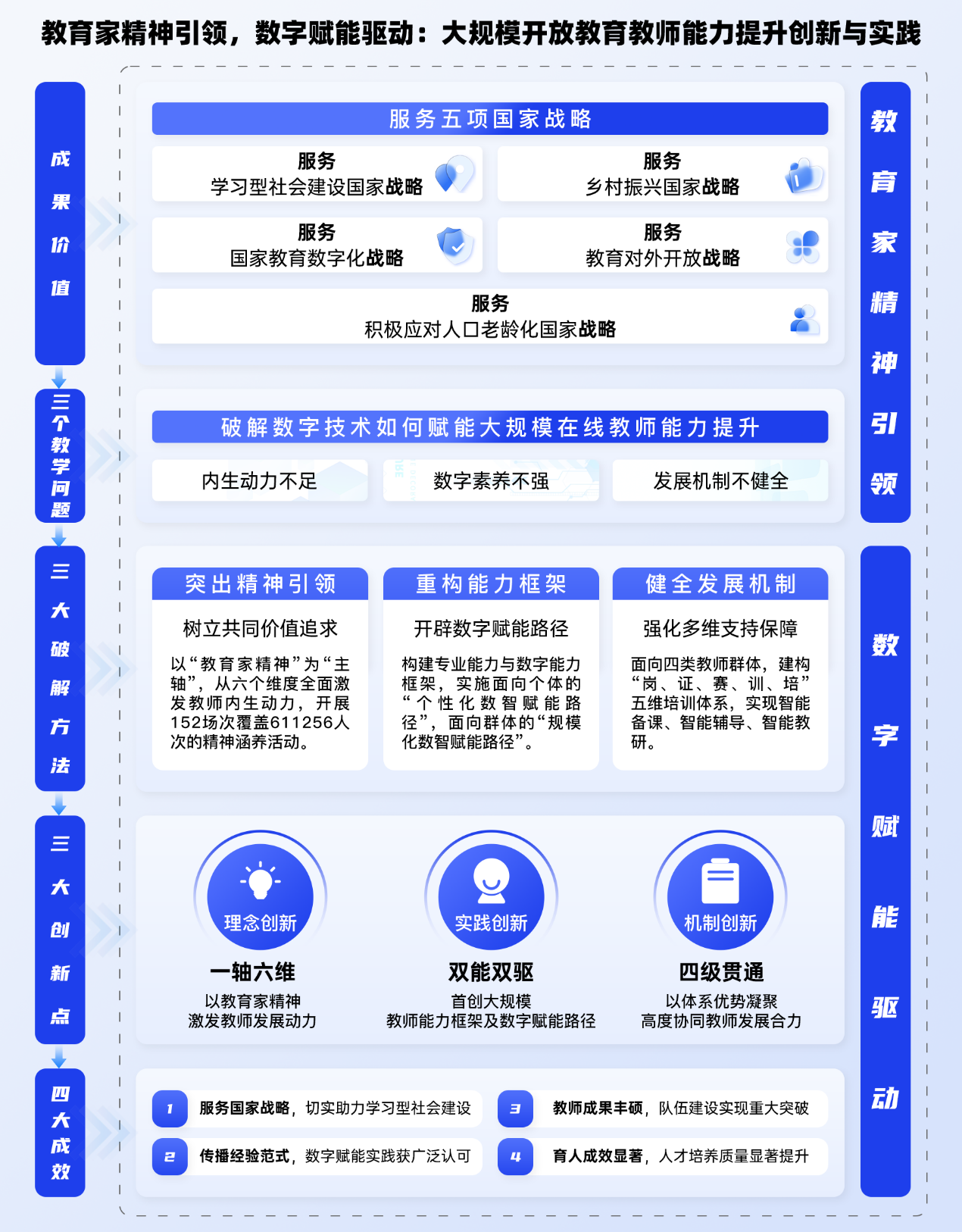 本成果锚定开放教育教师队伍“内生动力不足、数字素养不强、发展机制不健全”等现实困境,从2012年起,坚持“共同价值引领、数字赋能驱动”理念,以培养专业能力与数智能力并重的开放教育教师队伍为发展目标,首创“一轴六维”精神赋能理念机制,构建“双能双驱”数字赋能教师能力提升工法,健全“四级贯通”专业发展机制,取得高水平教师队伍建设和高质量人才培养的双向效果,切实服务五项国家战略,为学习型社会建设提供“国开经验”,为全球大规模在线教育发展提供“中国方案”。