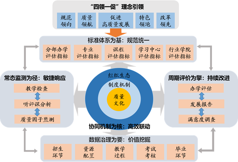 国家开放大学以习近平新时代中国特色社会主义思想为指导,以“规范领向、质量领航、特色领跑、改革领先,促进开放教育高质量发展”的“四领一促”理念为引领,构建“标准体系为基、数据治理为要、常态监测为径、周期评价为擎、协同机制为核”的“五维一体”国家开放大学质量保障体系。