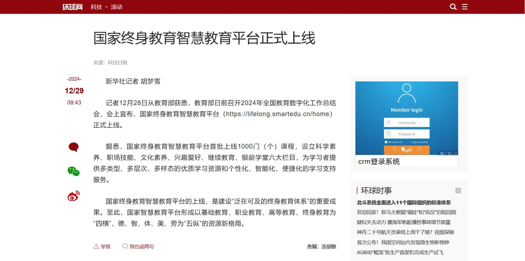 2024年12月29日,环球网发布《国家终身教育智慧教育平台正式上线》