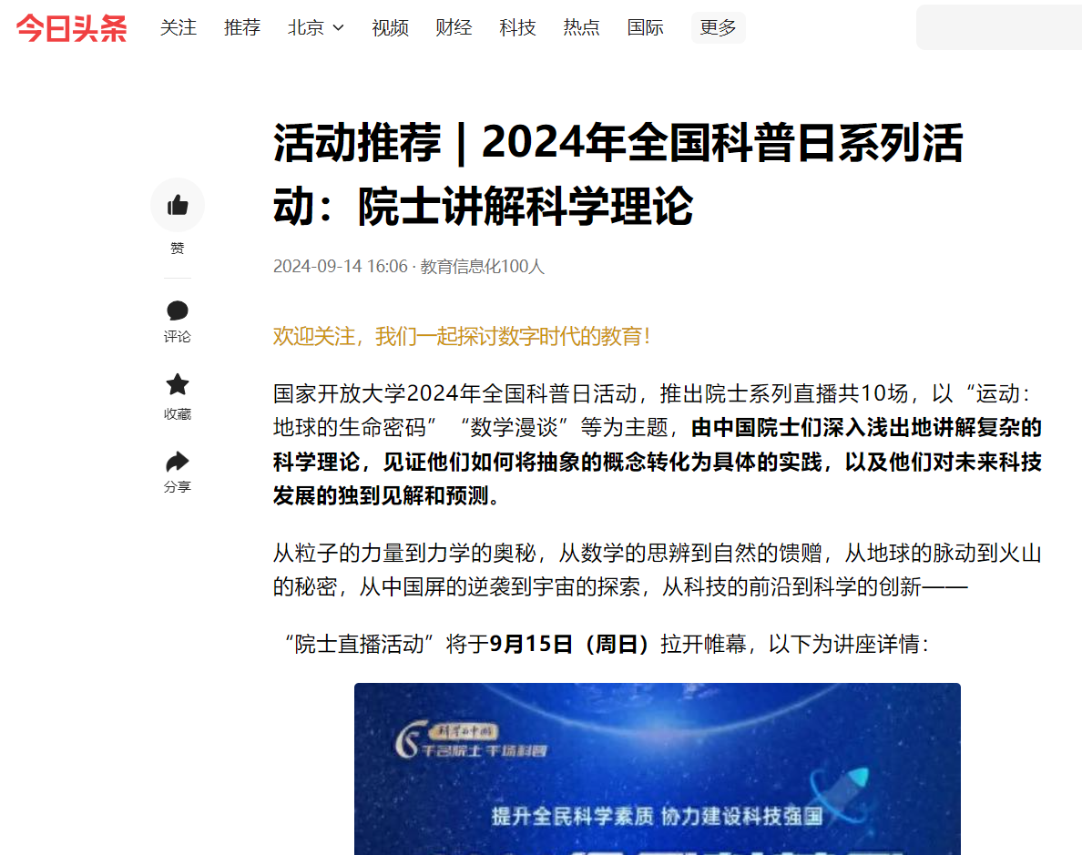 2024年9月14日,今日头条发布《活动推荐 | 2024全国科普日系列活动:院士讲解科学理论》