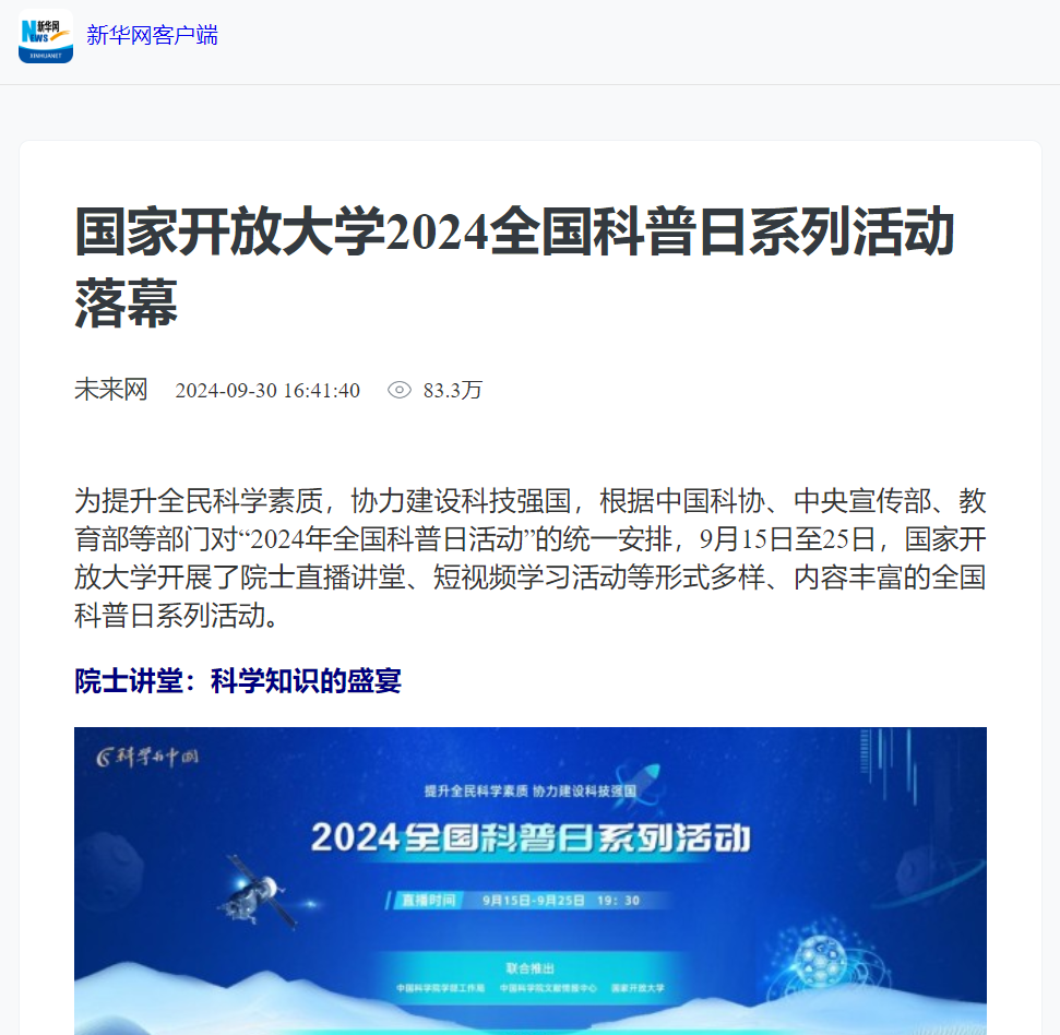 2024年9月30日,新华网发布《国家开放大学2024全国科普日系列活动落幕》