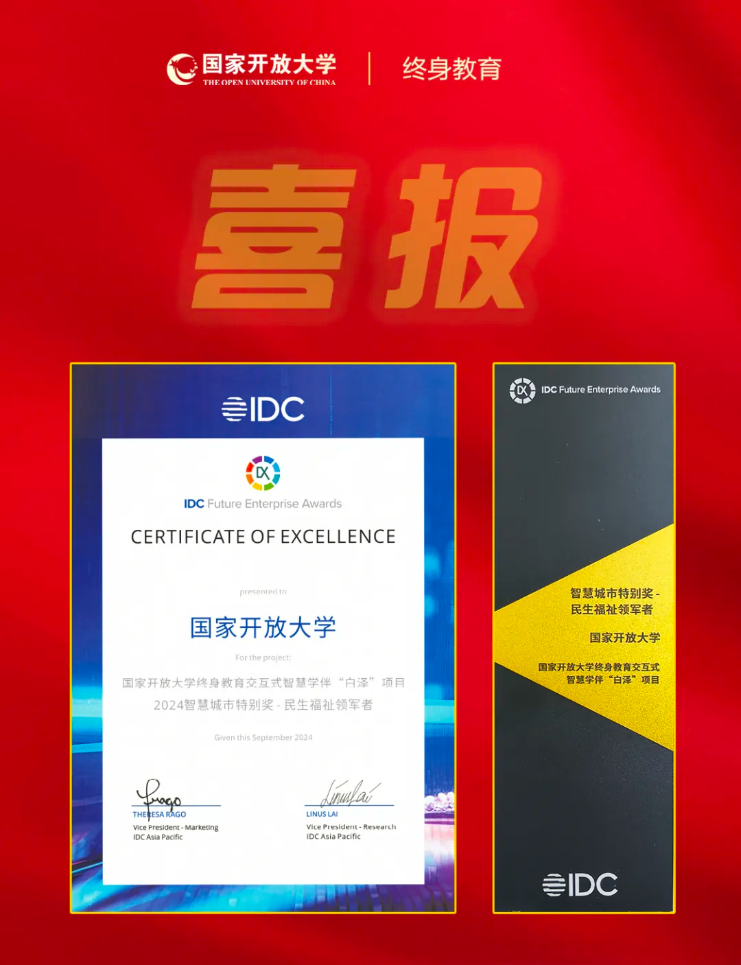 2024年8月29日,全球权威IT市场研究和咨询公司IDC(International Data Corporation)公布了“2024 IDC中国未来企业大奖”获奖名单,国家开放大学终身教育平台智慧学伴“白泽”项目荣获“智慧城市特别奖-民生福祉领军者”优秀奖和卓越奖。