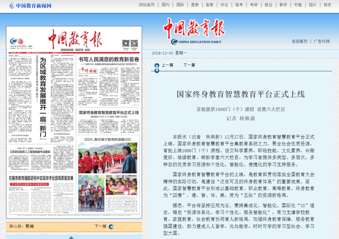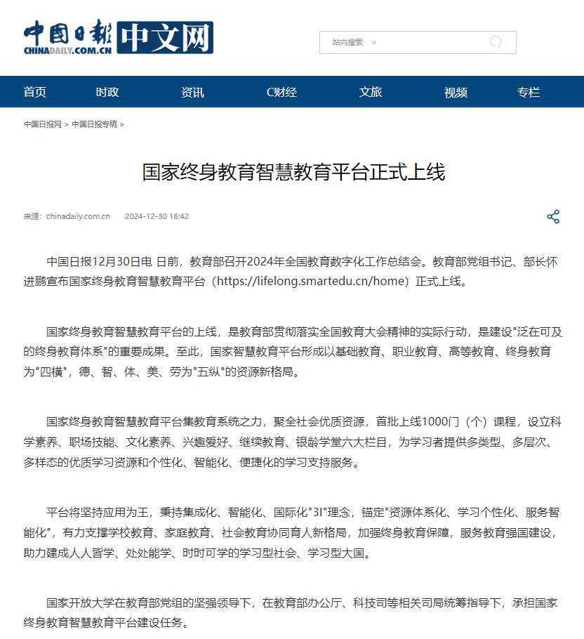 2024年12月30日,中国日报网发布《国家终身教育智慧教育平台正式上线》