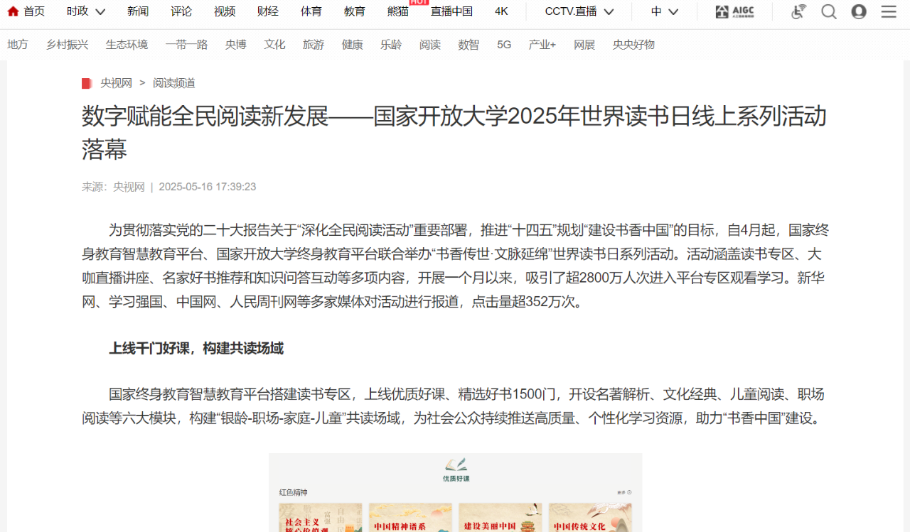 2025年5月16日,央视网发布《数字赋能全民阅读新发展——国家开放大学2025年世界读书日系列活动落幕》