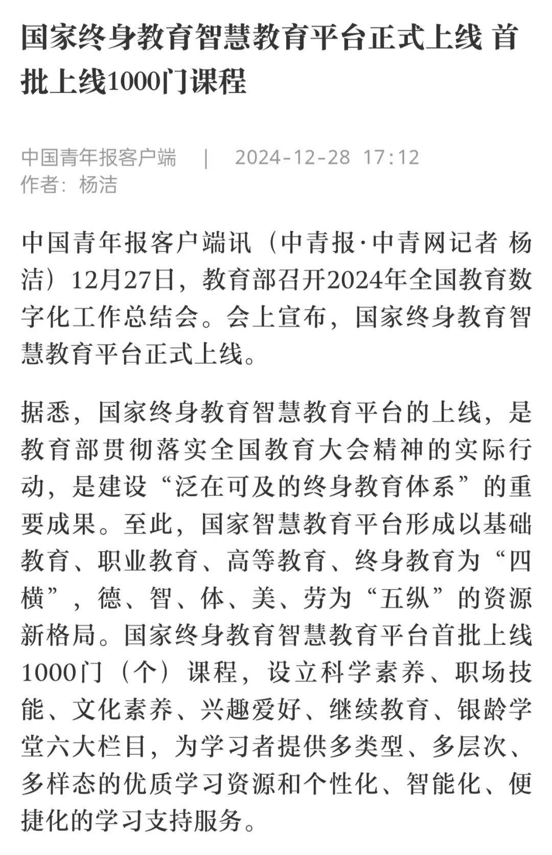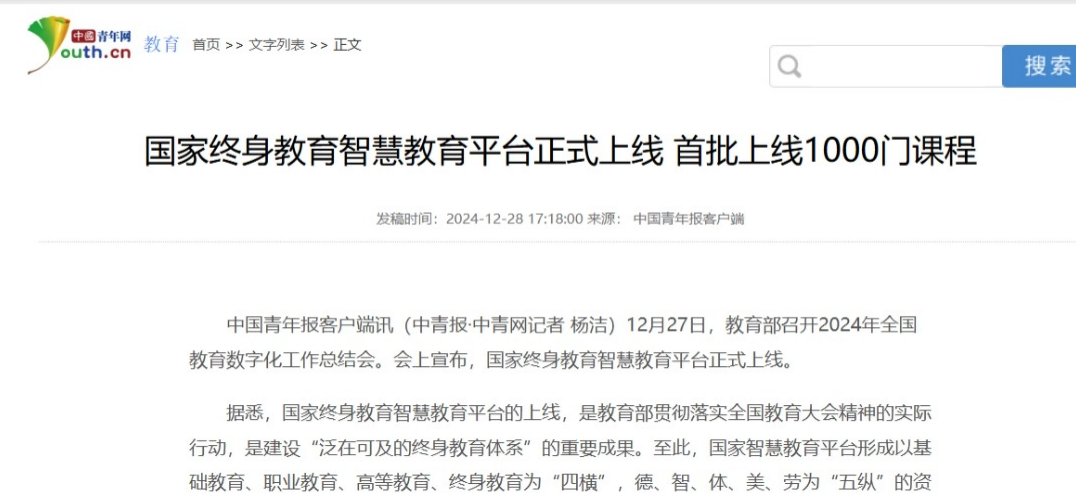 2024年12月28日,中国青年报客户端发布《国家终身教育智慧教育平台正式上线》