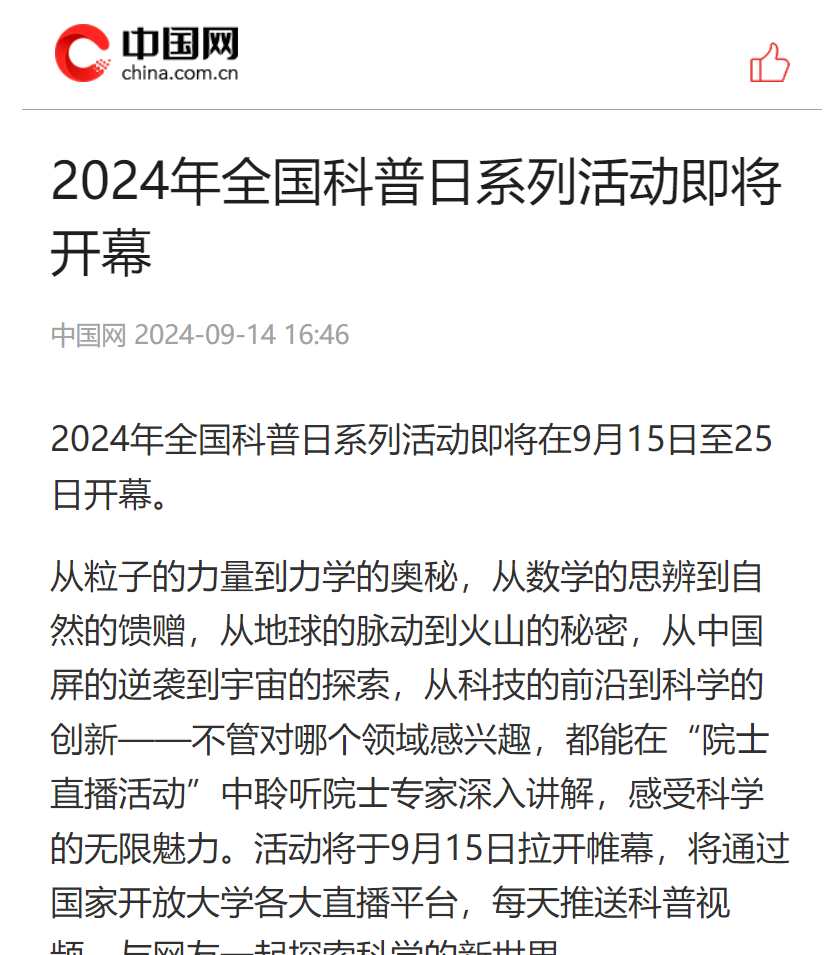 2024年9月14日,中国网发布《2024全国科普日系列活动即将开幕》