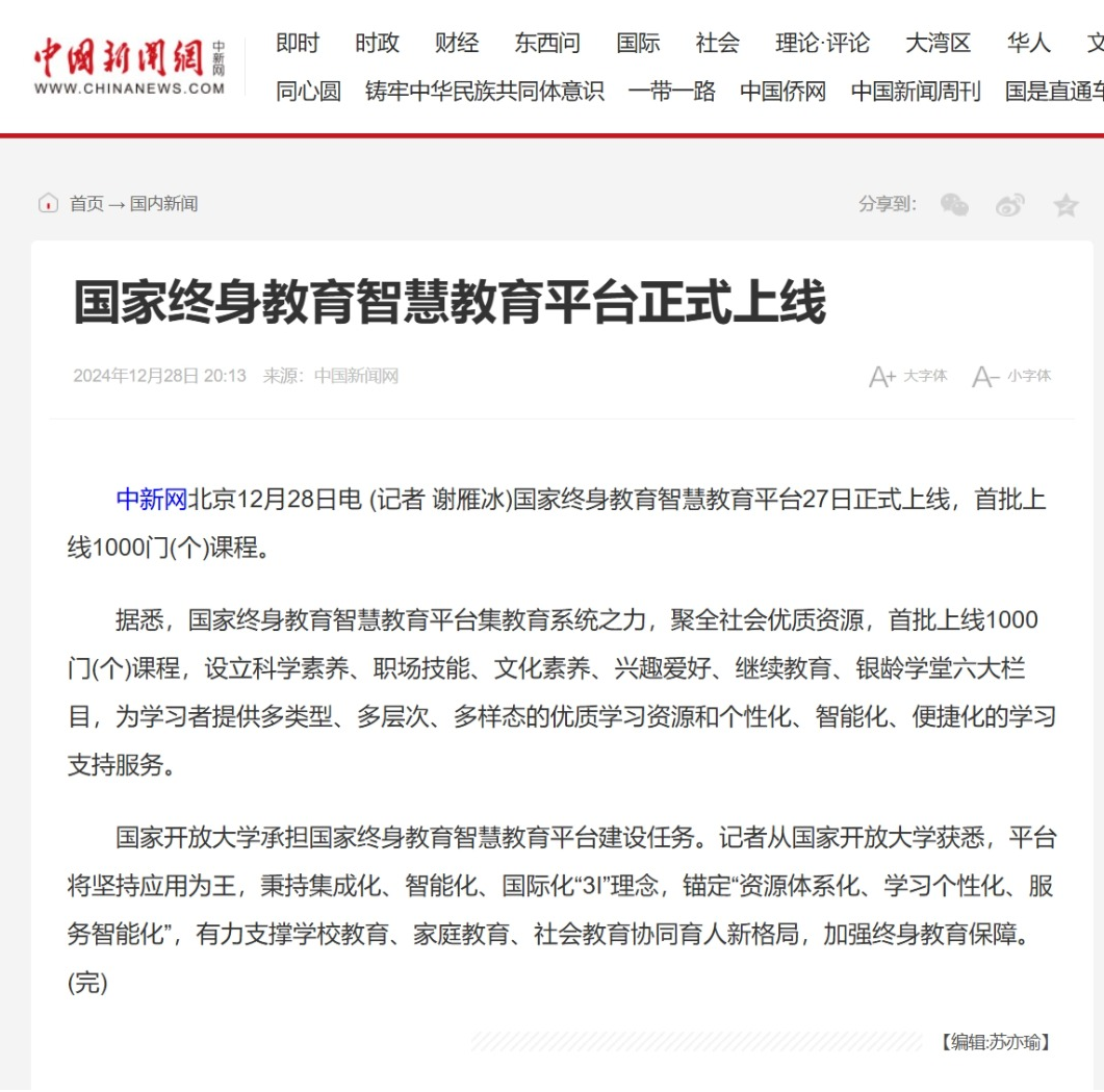 2024年12月28日,中国新闻网发布《国家终身教育智慧教育平台正式上线》