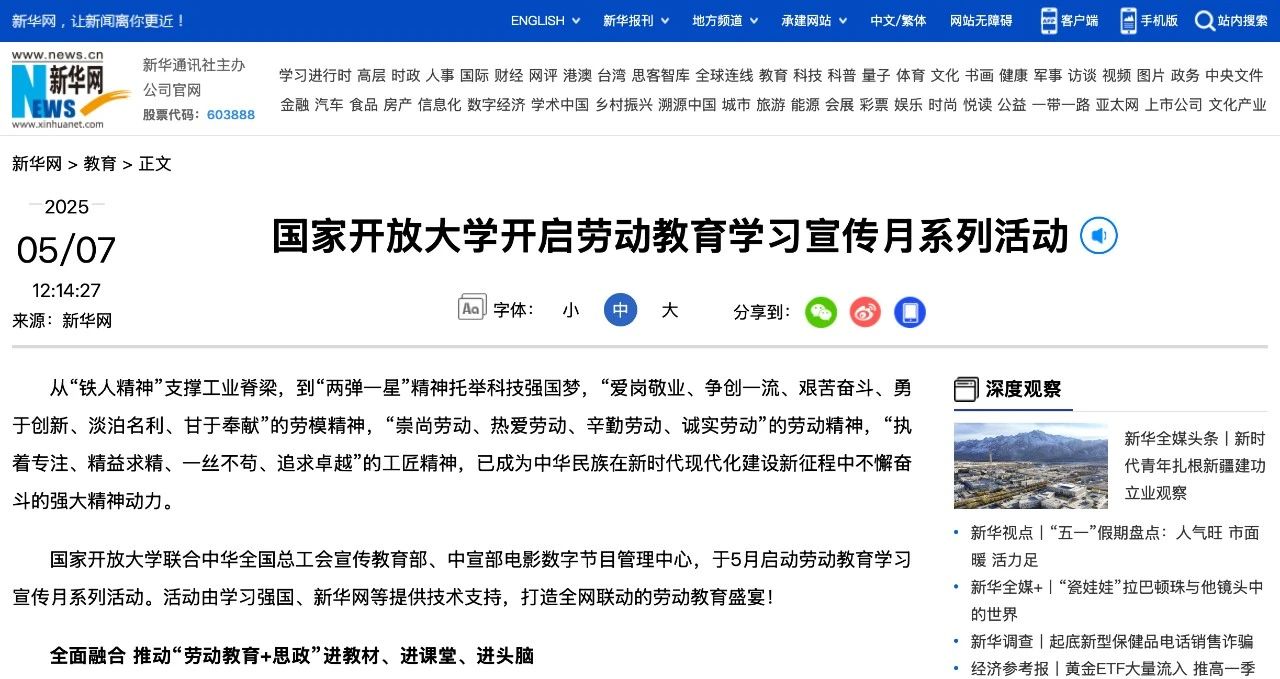 2025年5月7日,新华网发布《国家开放大学开启劳动教育学习宣传月系列活动》