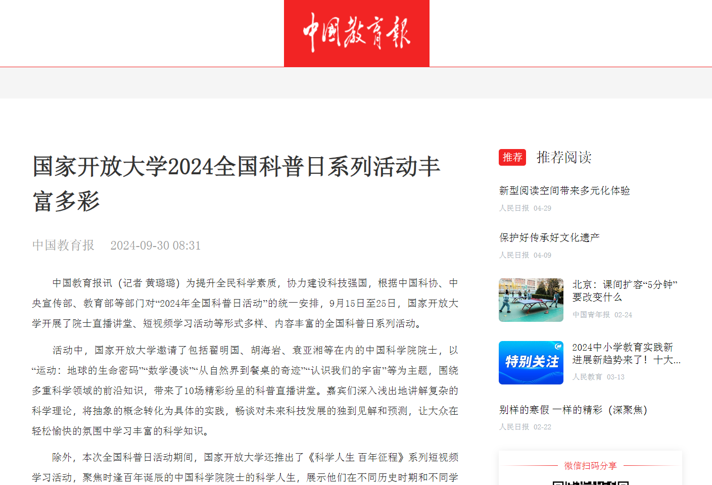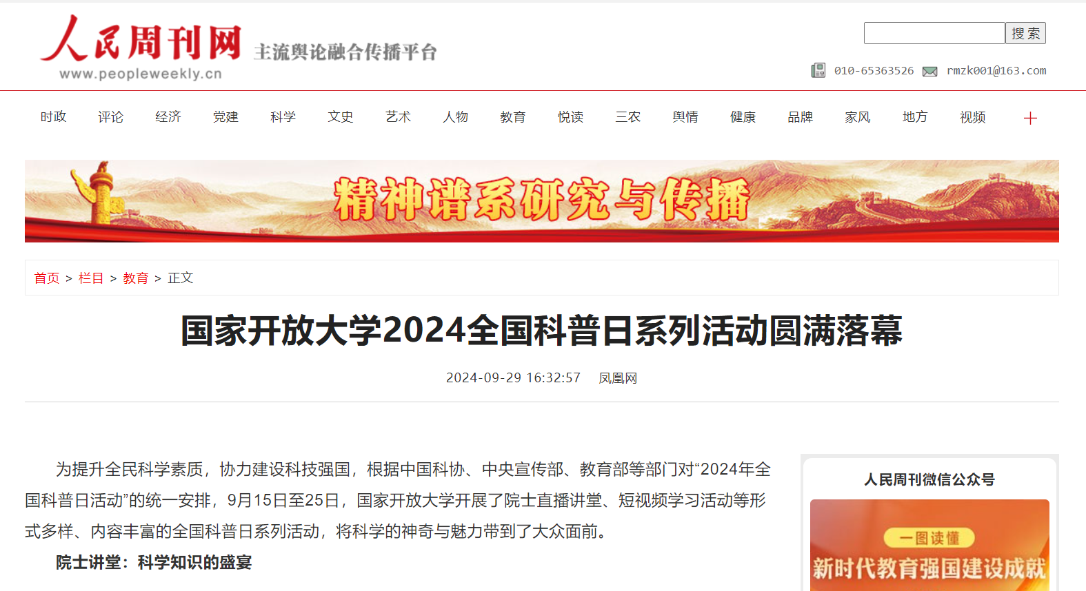 2024年9月29日,人民周刊网发布《国家开放大学2024全国科普日系列活动圆满落幕》