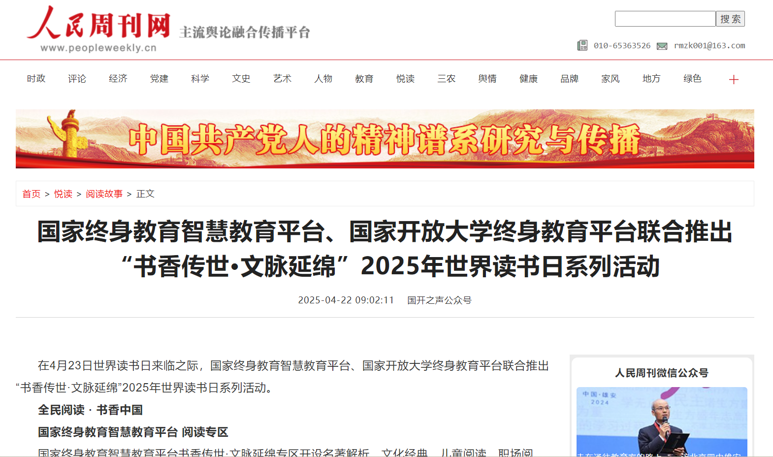 2025年4月22日,人民周刊网发布《国家终身教育智慧教育平台、国家开放大学终身教育平台联合推出“书香传世·文脉延绵”2025年世界读书日系列活动》