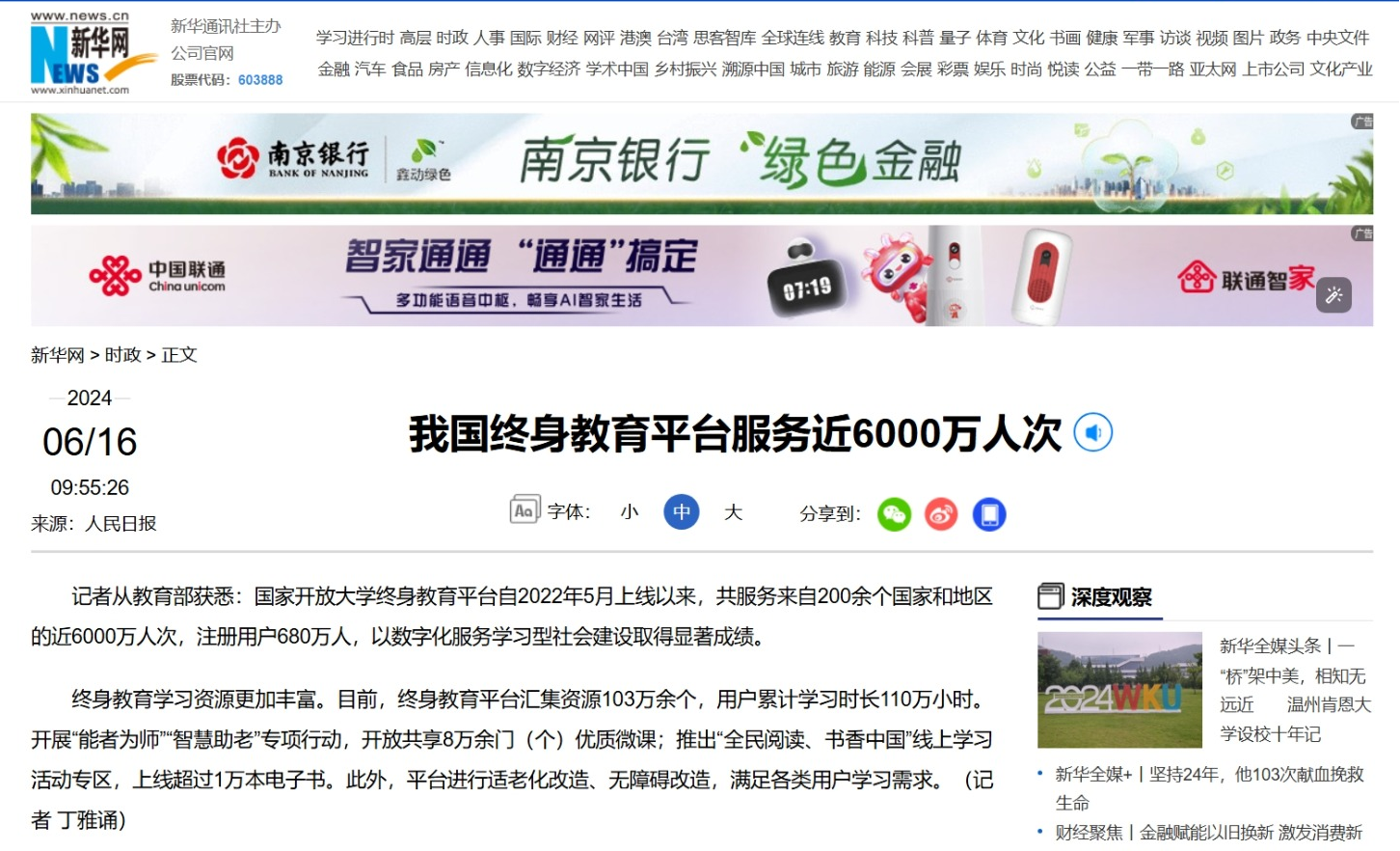 2024年6月16日,新华网发布《我国终身教育平台服务近6000万人次》
