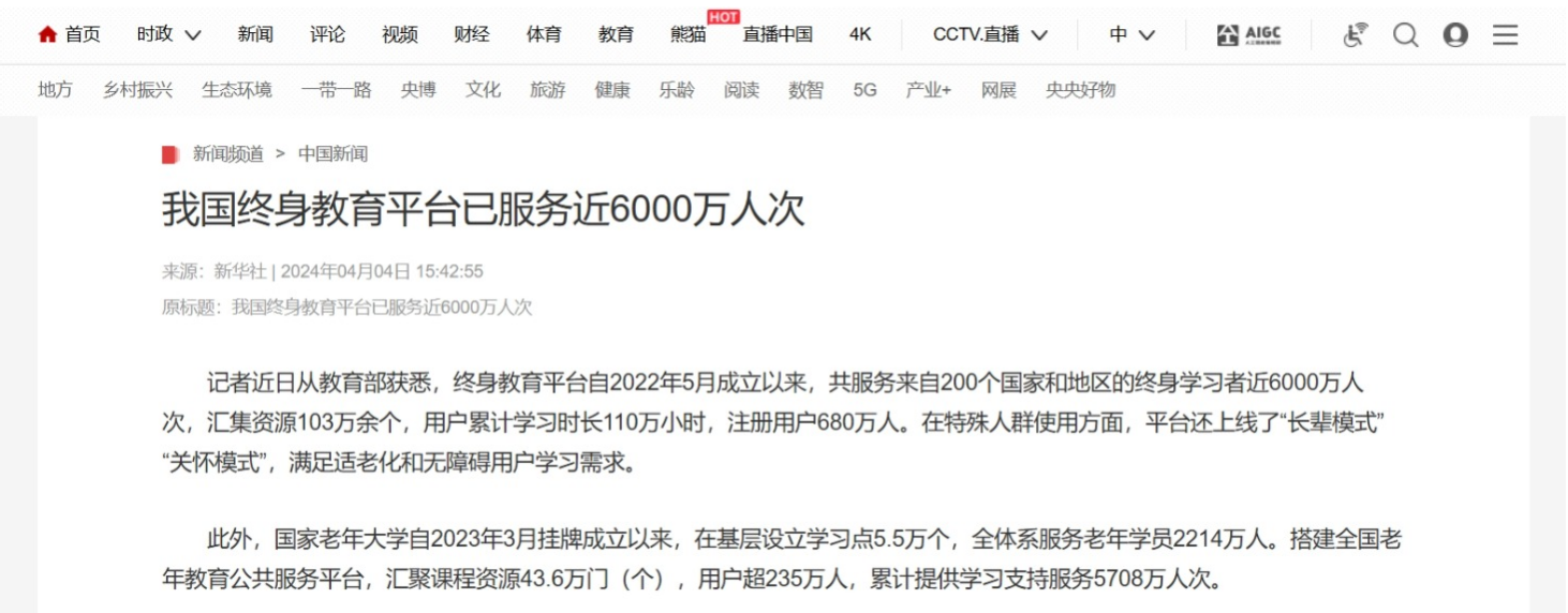 2024年4月4日,央视网发布《我国终身教育平台服务近6000万人次》