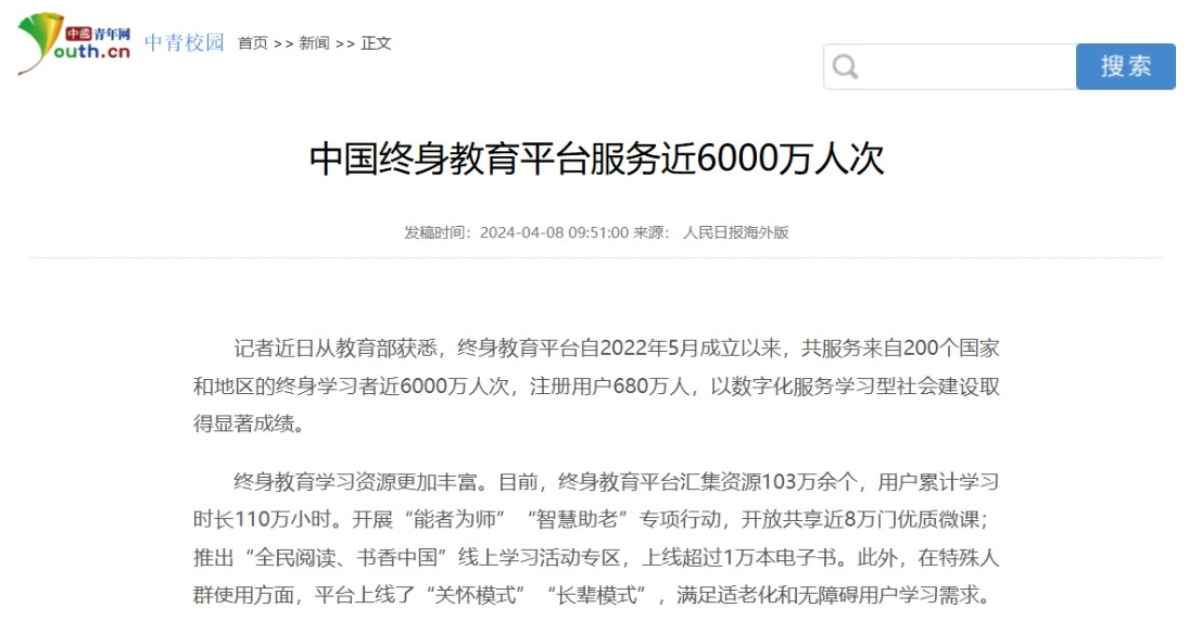 2024年4月8日,中国青年网发布《中国终身教育平台服务近6000万人次》