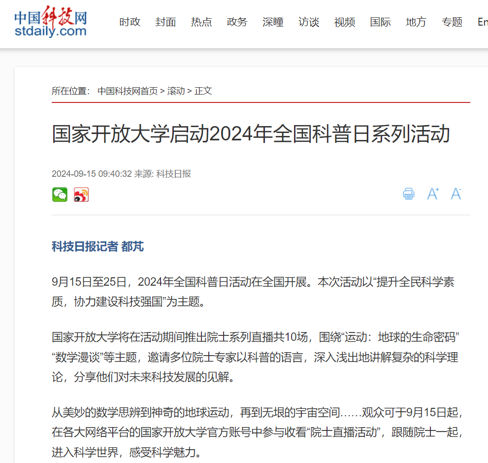 2024年9月15日,中国科技网发布《国家开放大学启动2024全国科普日系列活动》