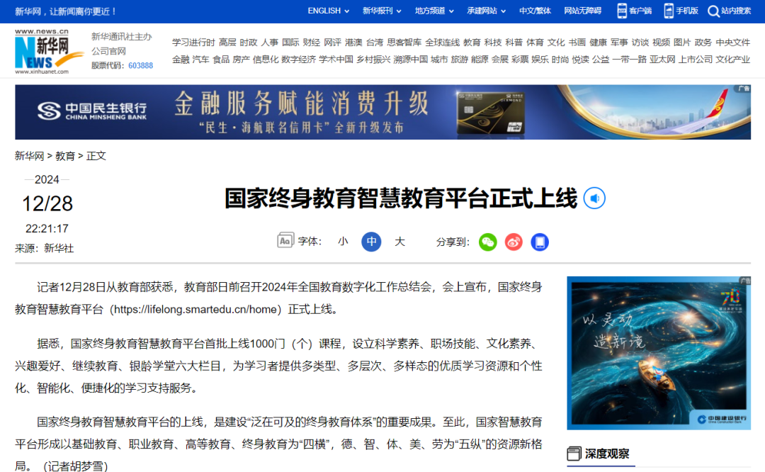 2024年12月28日,新华网发布《国家终身教育智慧教育平台正式上线》
