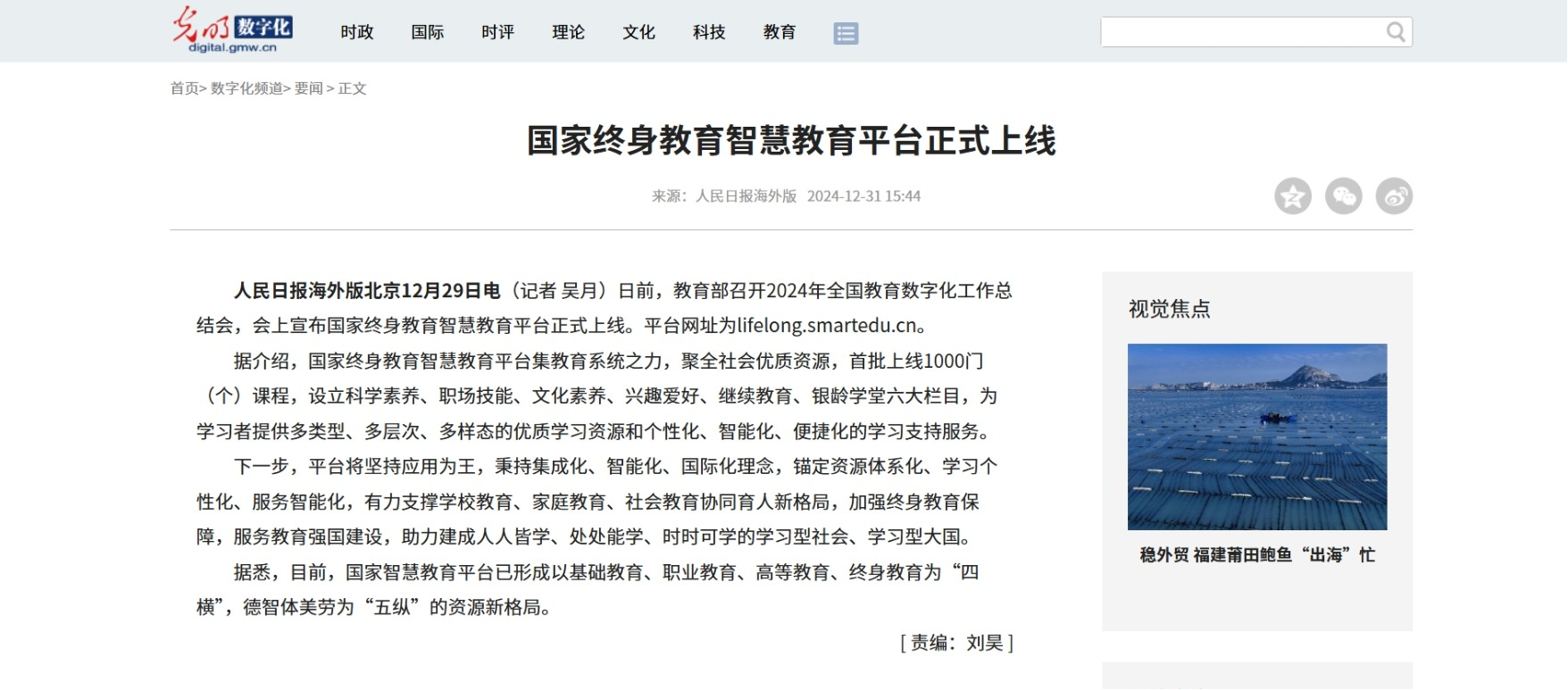 2024年12月31日,光明网发布《国家终身教育智慧教育平台正式上线》