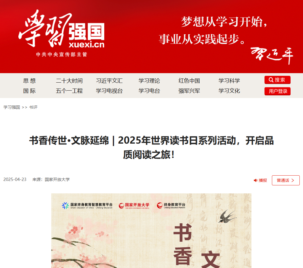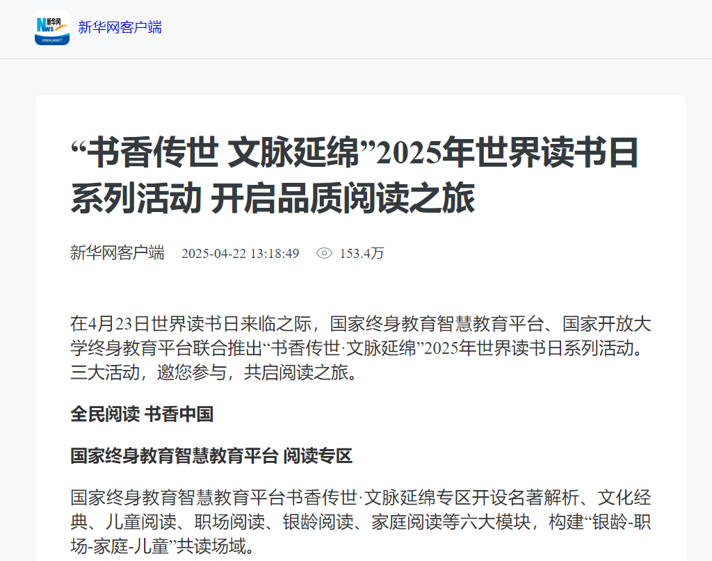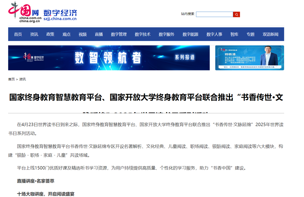 2025年4月23日,中国网发布《国家终身教育智慧教育平台、国家开放大学终身教育平台联合推出“书香传世·文脉延绵”2025年世界读书日系列活动》