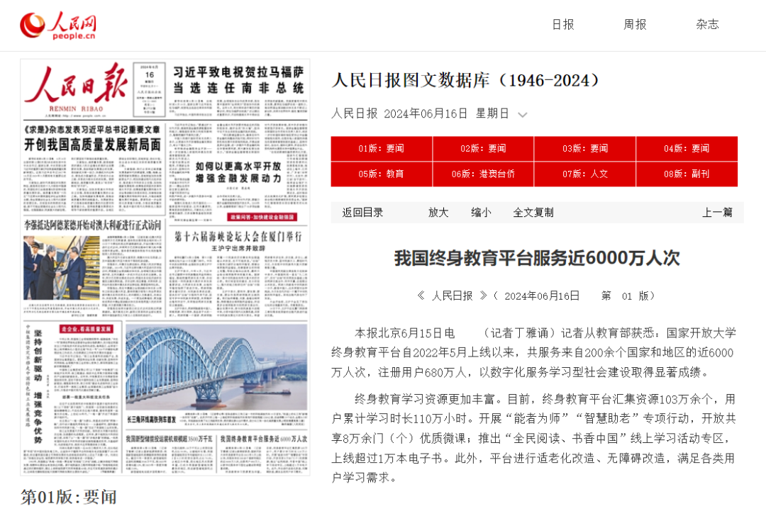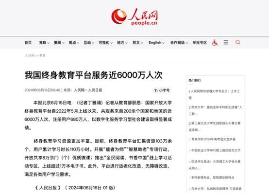 2024年6月16日,《人民日报》发布《我国终身教育平台服务近6000万人次》