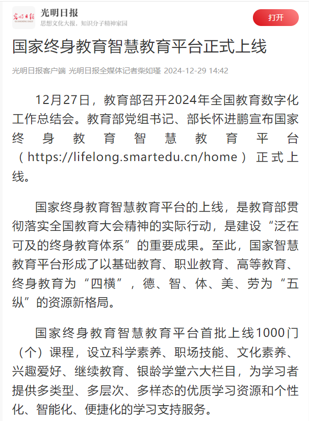2024年12月29日,光明日报客户端发布《国家终身教育智慧教育平台正式上线》