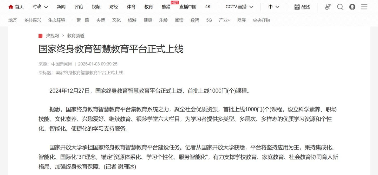 2025年1月3日,央视网发布《国家终身教育智慧教育平台正式上线》