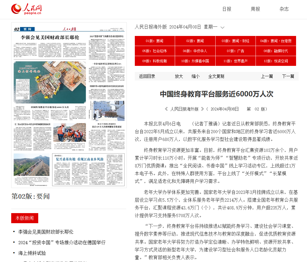 2024年4月8日,《人民日报》海外版发布《中国终身教育平台服务近6000万人次》