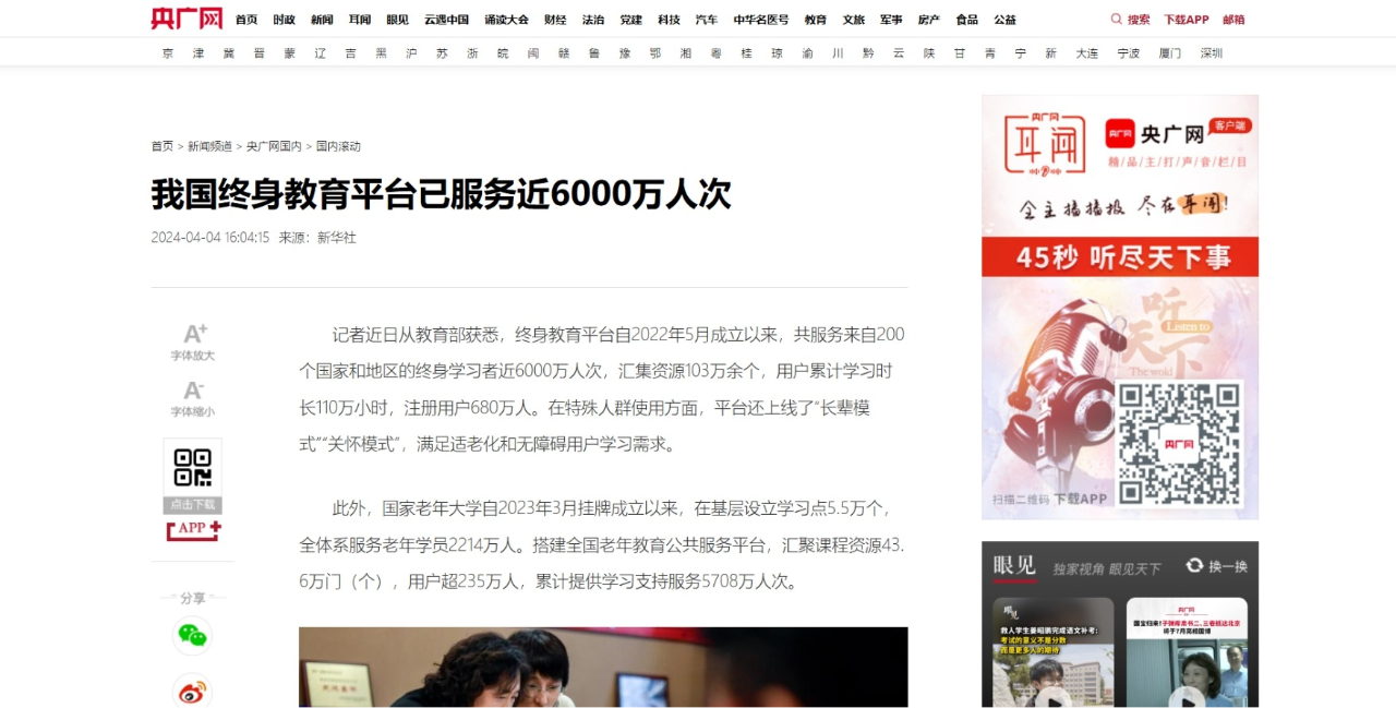 2024年4月4日,央广网发布《我国终身教育平台服务近6000万人次》