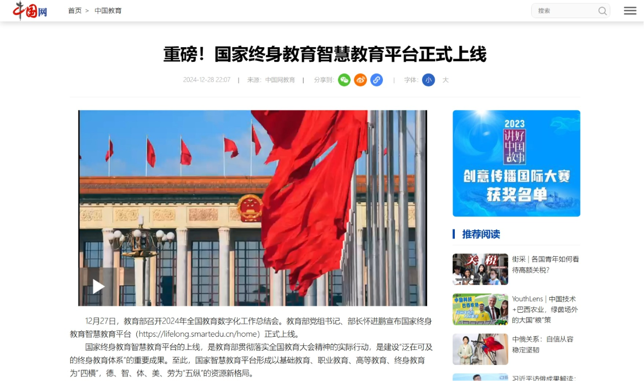 2024年12月28日,中国网发布《重磅!国家终身教育智慧教育平台正式上线》