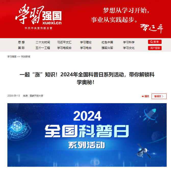 2024年9月13日,学习强国发布《一起“涨”知识!2024全国科普日系列活动,带你解锁科学奥秘!》