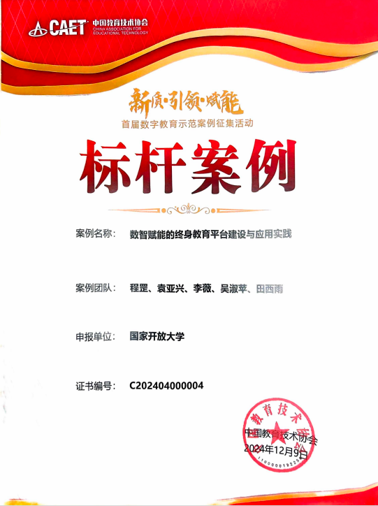 2024年12月9日,国家开放大学申报的“数智赋能的终身教育平台建设与应用实践”获评“新质·引领·赋能”首届数字教育示范案例征集活动标杆案例。
