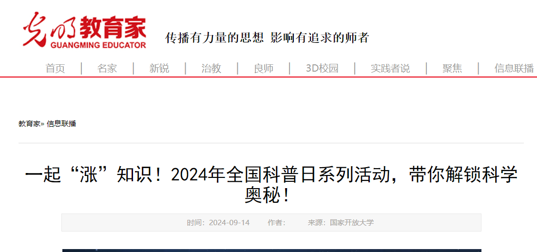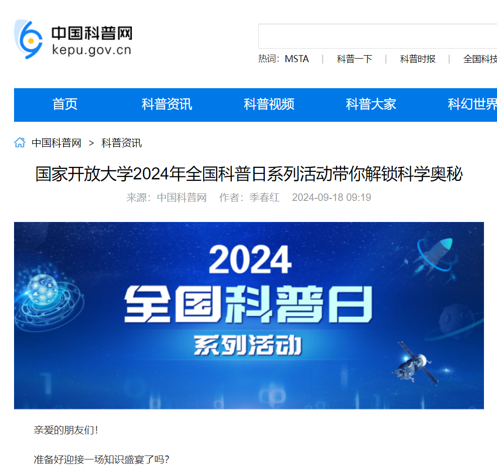 2024年9月18日,中国科普网发布《国家开放大学2024全国科普日系列活动带你解锁科学奥秘》
