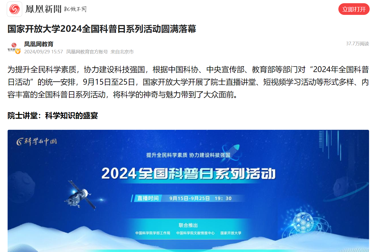 2024年9月29日,凤凰网发布《国家开放大学2024全国科普日系列活动圆满落幕》