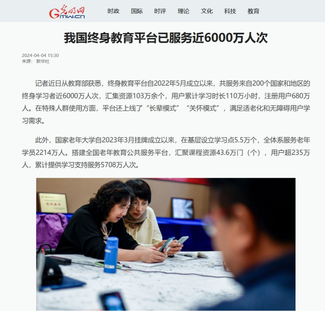 2024年4月4日,光明网发布《我国终身教育平台服务近6000万人次》