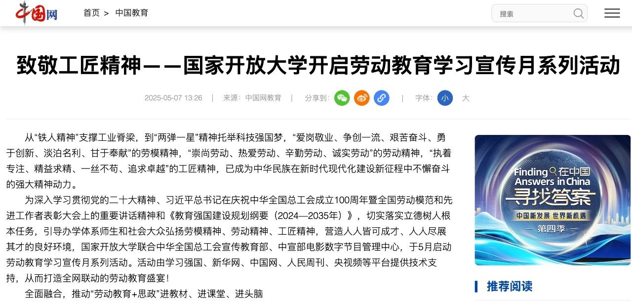 2025年5月7日,中国网发布《致敬工匠精神——国家开放大学开启劳动教育学习宣传月系列活动》