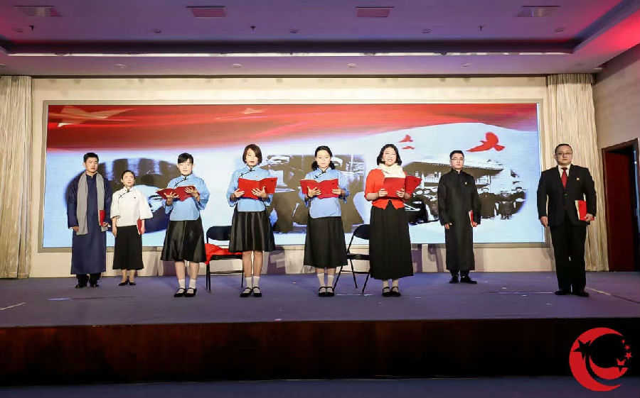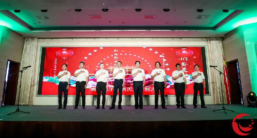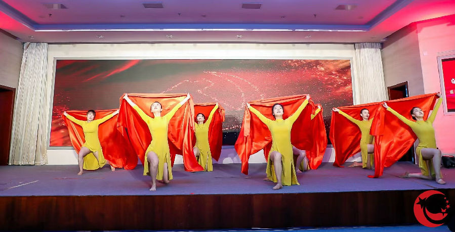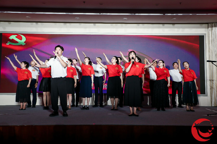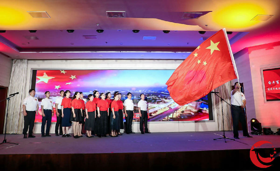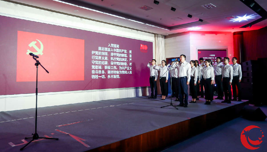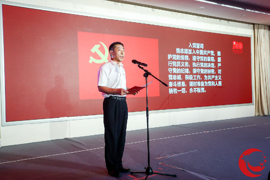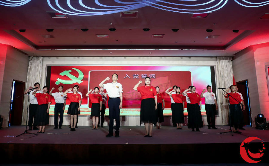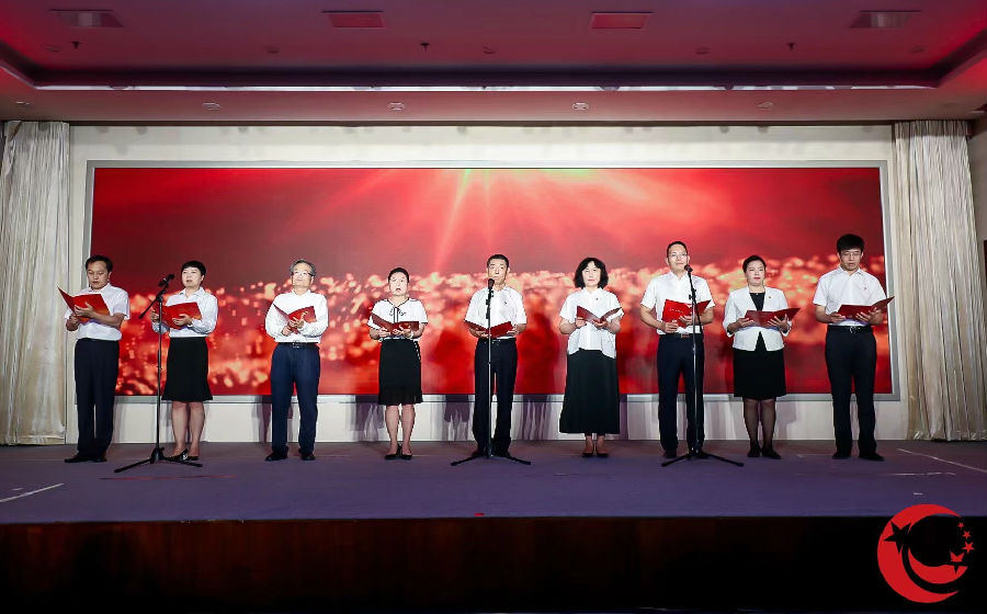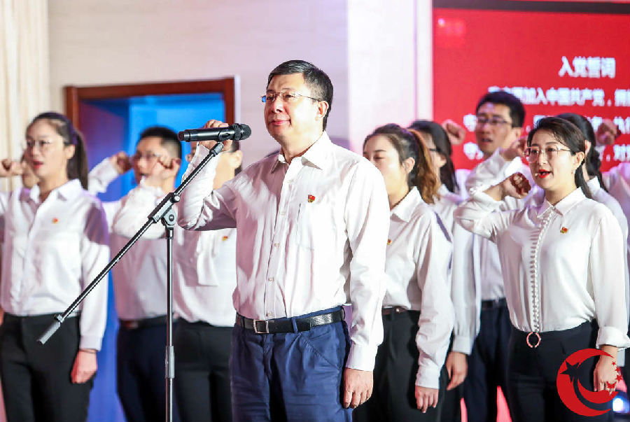 文艺汇演前,面向中国共产党党旗,党委书记荆德刚举起右拳,带领党员同志重温入党誓词。党委副书记刘臣主持宣誓仪式。