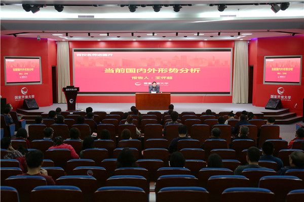 为学习贯彻党的十九届五中全会精神,加强时事政治教育,2020年11月3日,国家开放大学邀请中国科学社会主义学会原会长、中共中央党校教授王怀超以《当前国内外形势分析》为题做专题讲座。此次讲座既是学校集体学习十九届五中全会精神的一次党课,也是“百校名师进国开”系列活动之一。党委书记、校长荆德刚,党委常务副书记曹国永,副书记刘向虹以及部分教职工等100多人参加活动。