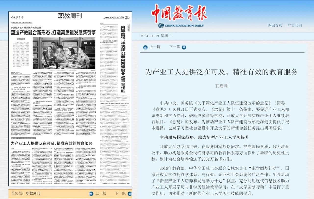 一是服务企业转型升级,助力新型产业工人成长发展。探索了国家开放大学与行业、企业合作办学的新模式和新机制,推动了学历教育与行业、企业职工培训体系对接,为学习型行业、学习型企业建设服务。