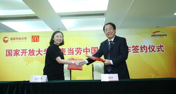 国家开放大学校长杨志坚和麦当劳(中国)首席执行官张家茵代表双方签署了合作协议。协议明确,国家开放大学将按照“求学圆梦行动”要求,依托立体覆盖全国城乡的办学组织体系和线上线下一体化教育服务能力,与麦当劳中国共同探索实践“互联网+”背景下的大型企业人才培养新模式。