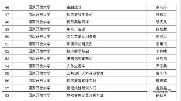 2016年6月,教育部公布第一批“国家级精品资源共享课”,共有来自北京大学等高校的160门课程入选此次“国家级精品资源共享课”。其中国家开放大学13门课程成功入选,成为国家公认的优质“网络教育课程”。此项工作历时5年,经过课程组与相关管理人员的辛勤耕耘与悉心打造,此项工作终于收获了果实,国家开放大学成功为全社会学习者送出了高质量的学习课程。