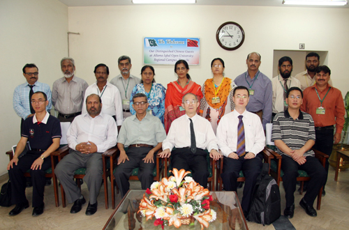 10月4日,张辉副书记一行对阿拉玛·伊克巴尔开放大学卡拉奇开放教育中心进行了实地调研。卡拉奇学习中心负责人Syed Tariq Hussain先生向代表团介绍了学习中心的情况,包括发展历史、校园规模、招生、学习支持、图书馆建设等。(摄影:于旻生)
