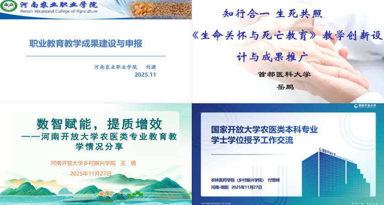 河南农业职业学院原党委书记刘源以“多方协同、五阶贯穿、平台赋能”培育新农人的典型案例为切入点,分享了国家级教学成果培育经验;首都医科大学教授岳鹏以《生命关怀与死亡教育》课程为例介绍了其团队在全国高校教师教学创新大赛中的获奖经验与参赛体会;国家开放大学第四届学位评定委员会农医学分委员会秘书长付晋峰、河南开放大学乡村振兴学院院长王倩分别围绕国家开放大学农医类本科专业学士学位相关工作、河南开放大学农医类专业建设和成效作分享交流。