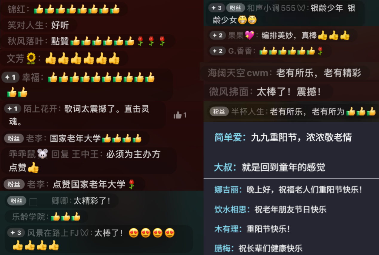 “太飒了,又酷又飒”“这是岁月不负追梦人的真实写照”“必须为主办方点赞”……类似激动又温馨的评论在重阳特别节目2025“乐龄杯”全国老年文艺展演活动总展演和闭幕式晚会播出期间刷屏,让直播间的氛围持续升温。