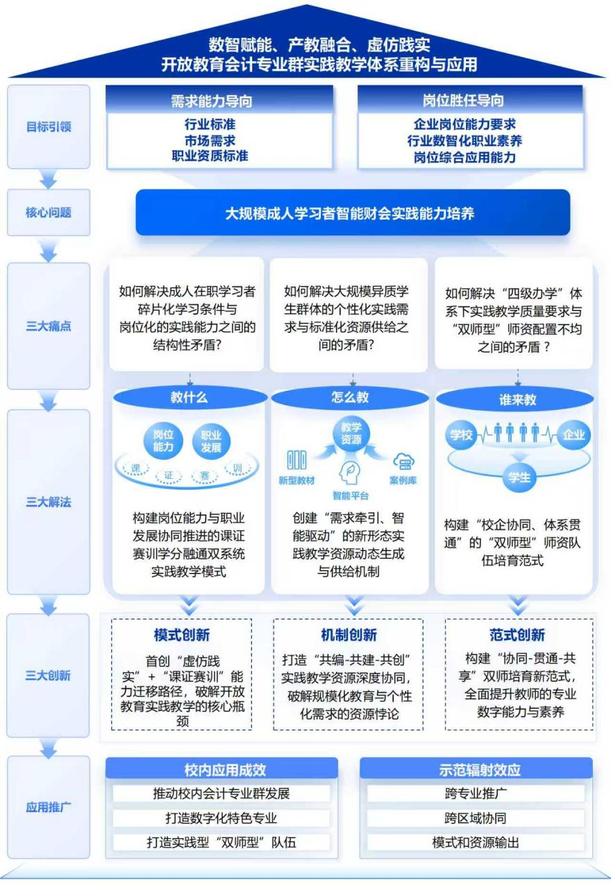 该成果响应国家教育数字化战略,聚焦开放教育会计专业群实践教学痛点,以提升大规模成人学习者智能财务实践能力为核心,历时10年构建创新体系,累计培养72万高素质人才。