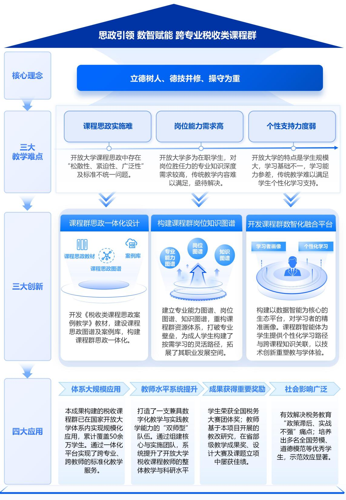 该成果针对开放教育中思政教育融入不深、学生岗位胜任力不足等核心问题,以“思政引领、数智赋能”为主线,开展了跨专业税收课程群一体化建设与实践。