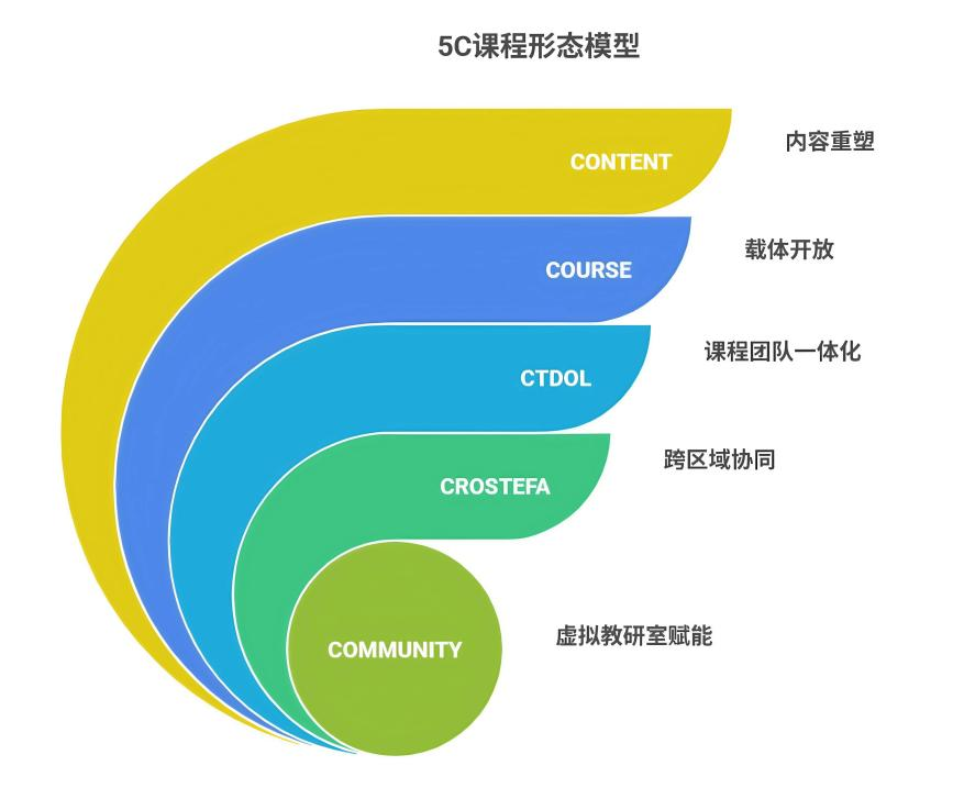 该成果立足教育强国战略,依托“媒体辅助英语教学高校虚拟教研室”,联合国内外70余所高校,聚焦新文科背景下外语人才培养需求,创新构建了服务终身学习的“5C课程形态”模型。该模型以数字化、智能化、开放性、灵活性和终身化为核心,通过CONTENT(内容)、COURSE(课程)、CTDOL(课程和团队一体化)、CROSTEFA(跨区域一站式辅学)和COMMUNITY(虚拟教研室)五维协同,形成“建用一体、动态优化”机制。