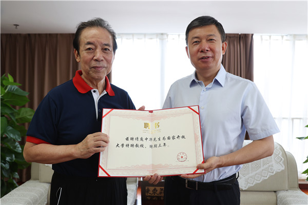 仪式上,荆德刚为庞中华颁发特聘教授证书。(摄影:诸葛寰宇)