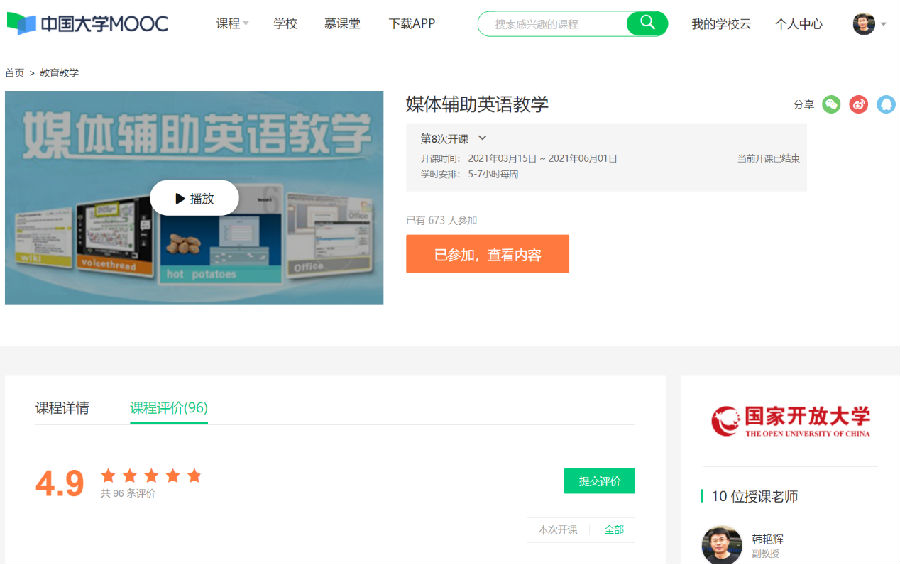 《媒体辅助英语教学》是一门实践操作类课程,以案例教学的方式,重点学习Office、Hot Potatoes、VoiceThread和Wiki等软件或云应用,设计并制作激发学生兴趣的辅助英语教学的课件。课程不设期终考试,实行100%形成性考核,重在严抓学习过程。该课程在国家开放大学学习网和中国大学MOOC累计连续运行23个学期,受到办学体系、普通高校学生和社会学习者的广泛好评。在此过程中,韩艳辉老师带领团队探索出“跨区域、一站式团队在线辅学”模式。迄今,该MOOC累计吸引国内外两万余名学习者选课学习,课程评价分高达4.9分(满分5分)。该课程的创新探索吸引了办学体系和普通高校专家学者的注意,如北京大学、北京师范大学、华东师范大学和上海海关学院等的研究者已经发表相关的系列研究成果。