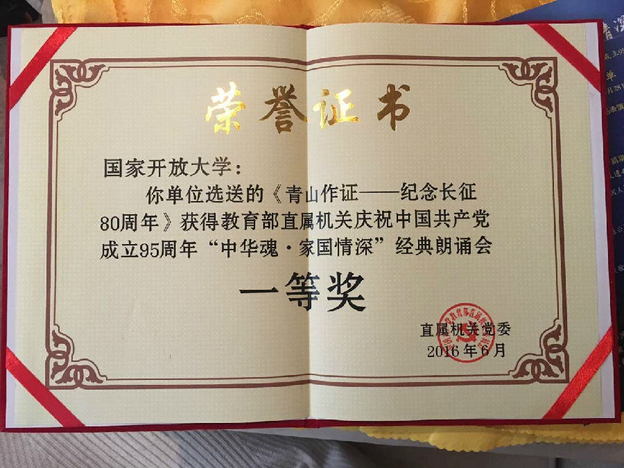 2016年6月24日,国家开放大学参加教育部机关党委组织“中华魂·家国情深”经典朗诵会,并从38个机关司局和直属单位42个参赛节目中脱颖而出,获得一等奖第一名的好成绩。